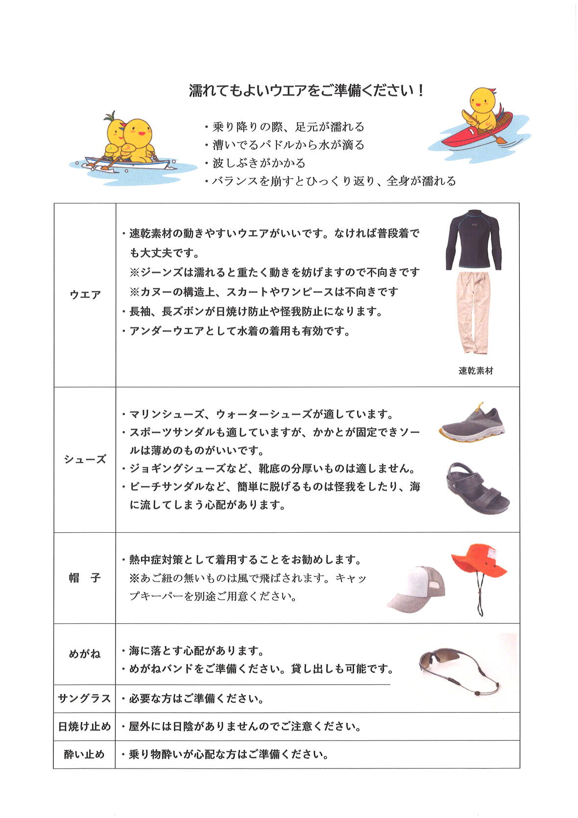 Q服装はどんなものを用意したらいいですか? A 濡れてもよい動きやすい服装でお越しいただくか、着替えをご準備ください。 ※転覆した場合は下着も濡れます。水着をアンダーウェアとされる方もいらっしゃいます。 足元は濡れてもよいかかとが低い靴やスポーツサンダルなどが適しています。 ※素足でのご利用はできません。