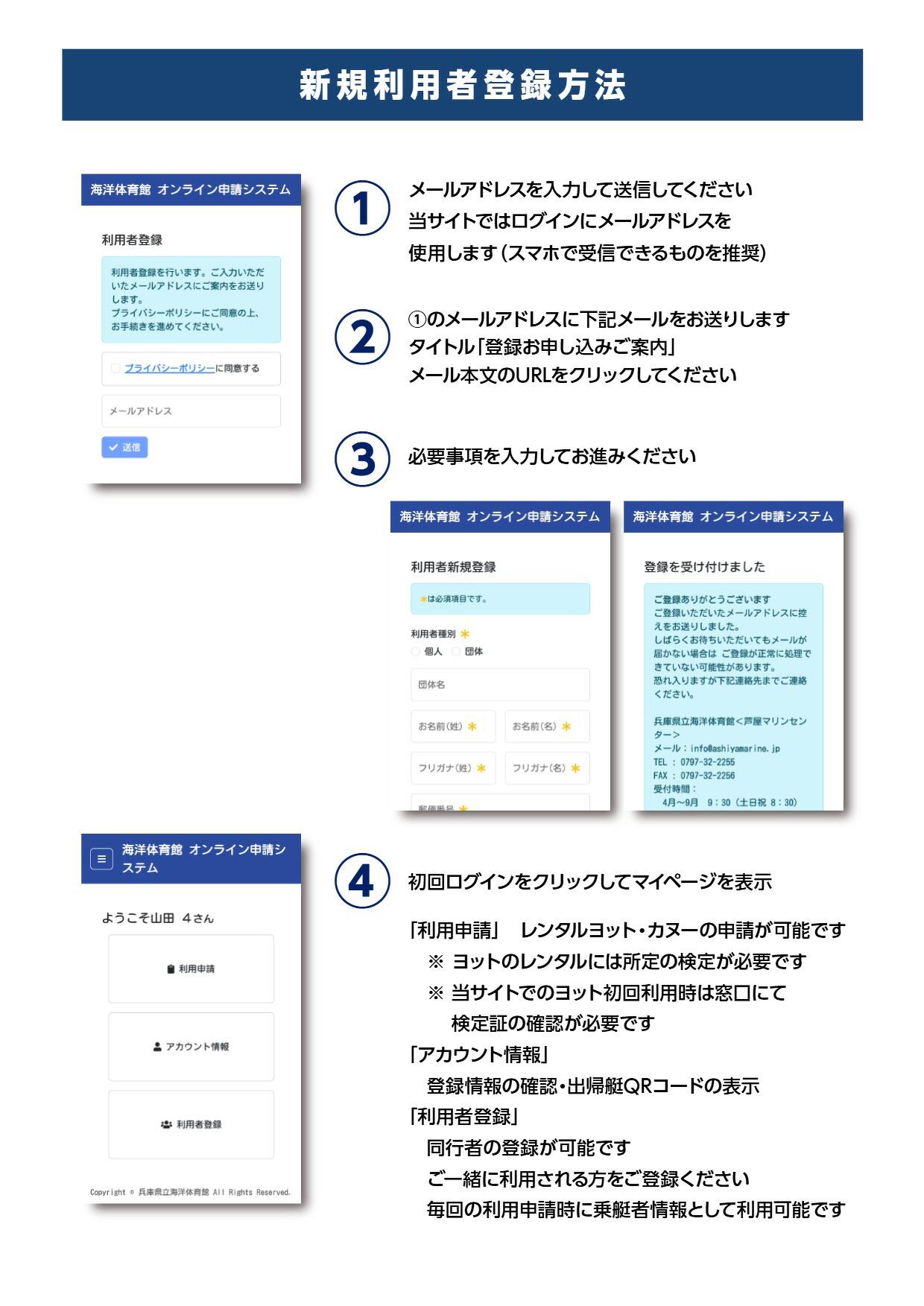 2025年11月26日(水) お知らせ 新システム【新規利用者登録・ログインはこちら】11月26日更新 下記URLより、『新規利用者登録・ログイン』をお願いいたします。 ※選択していただく箇所がご不明な点等ございましたらお知らせください。 ヨットレンタルにつきましては、海洋体育館でレンタル会員として登録させていただいた後、選択が可能となります。 また、当面他の申請につきましても現在の申請書記入を併用しながら運用してまいります。 適宜改善してまいりますので、ご理解・ご協力をお願いいたします。 今後も詳細につきましては、ホームページならびに掲示板等でお知らせします。 よろしくお願いいたします。